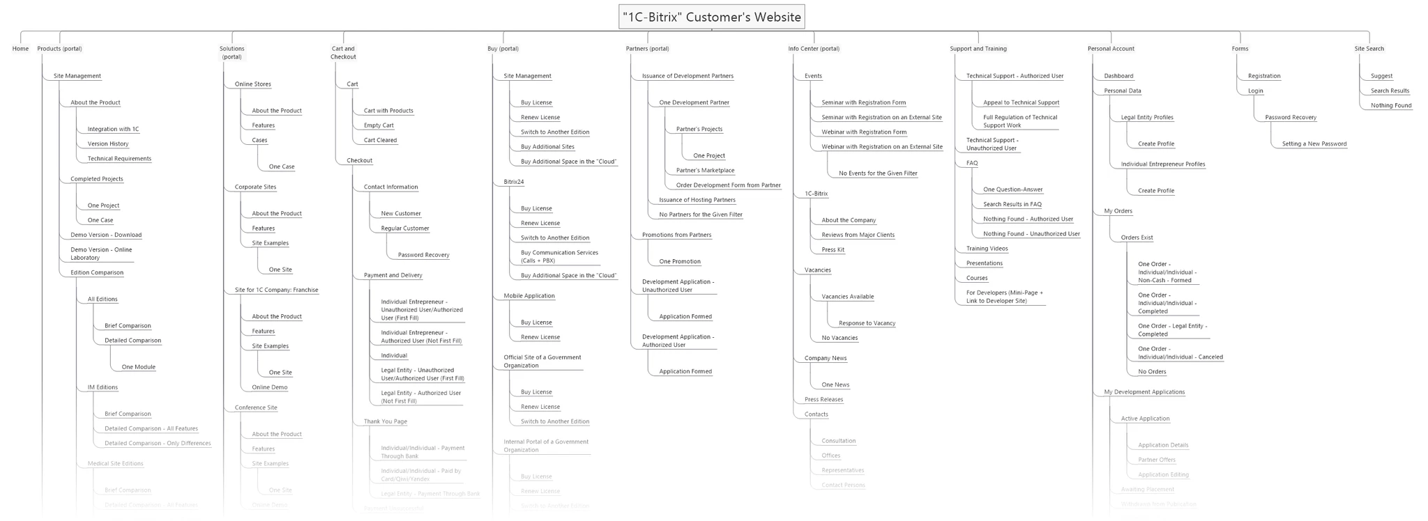 I developed a structure for the client and partner websites based on all the data collected during the work process, aiming to organize content and ensure logical navigation. The structure turned out to be quite extensive, so here I present only a part of it. The full structure is available via the links below.