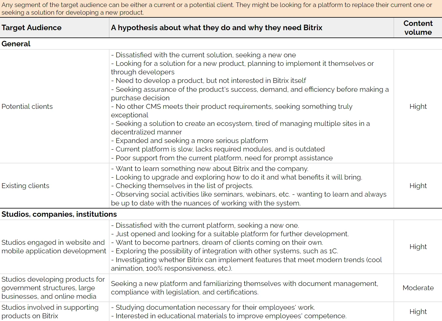 Here is a partial list of target audience segments. The full list is available in Google Sheets.
